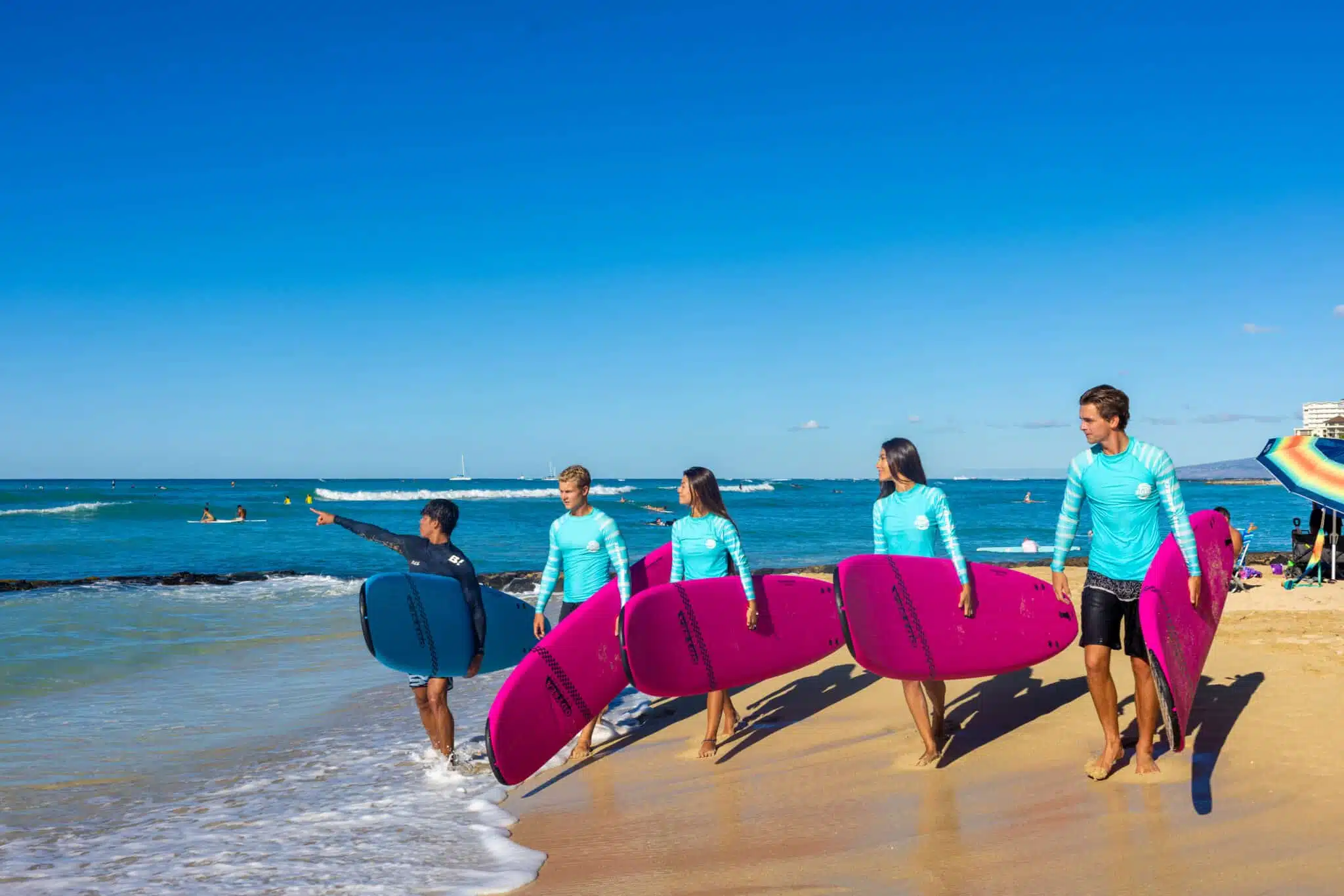 Our surf school is located directly on-property at The Twin Fin Waikīkī — check in on the sand, gear up, and walk a few steps to the water with your instructor. No shuttle, no parking hassle — just a smooth start to your lesson.